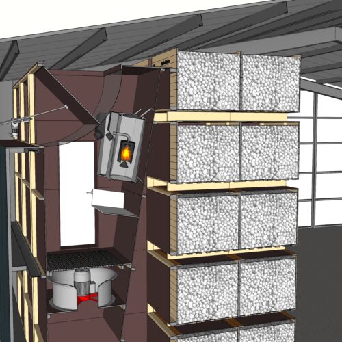 Geconditioneerd drogen geschiedt met gedroogde lucht. Daarom worden de kisten in een geïsoleerde ruimte geplaatst.