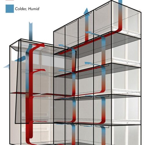 De openingen aan de voorzijde van het luchtverdeelsysteem sluiten perfect aan op de opening van elke kist pallet. Buitenlucht wordt aangezogen via een opening in de achterwand. Wanneer de buitenlucht te vochtig is, wordt de binnenlucht gerecirculeerd om optimale droogomstandigheden te behouden.